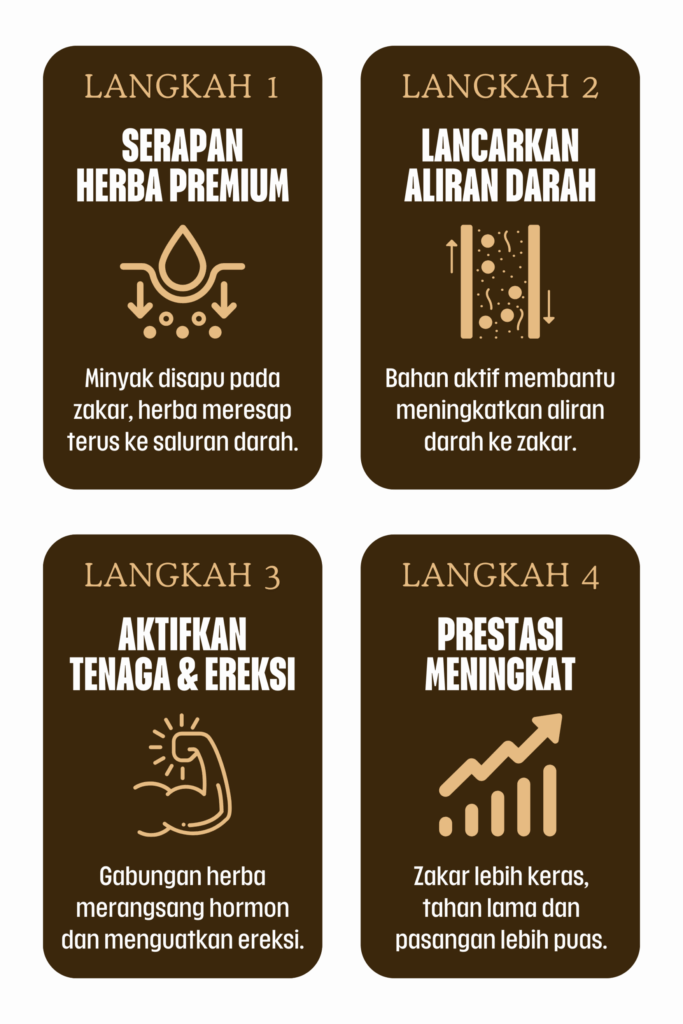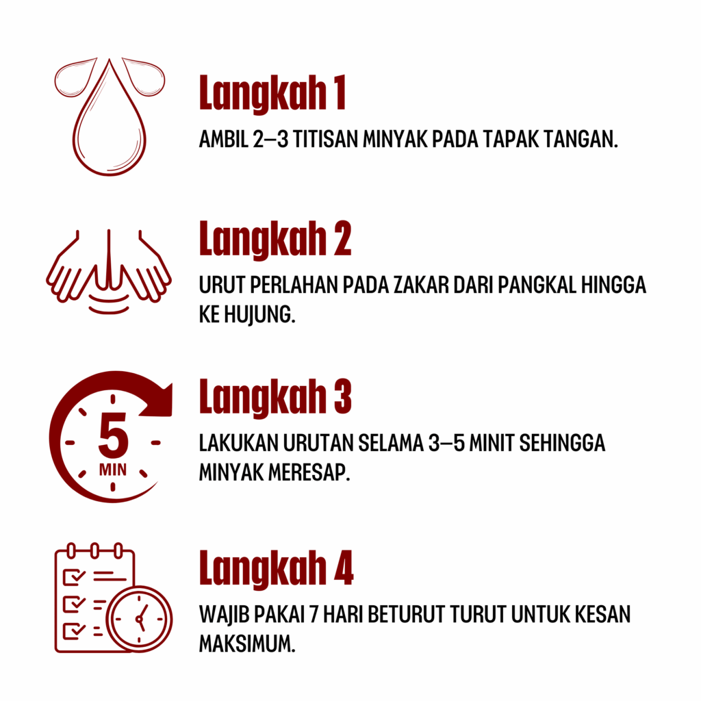 👉 Sapu dan urut perlahan pada zakar setiap hari sebelum tidur. Biarkan herba meresap ke saluran darah untuk kesan maksimum. Konsisten penting untuk hasil terbaik.